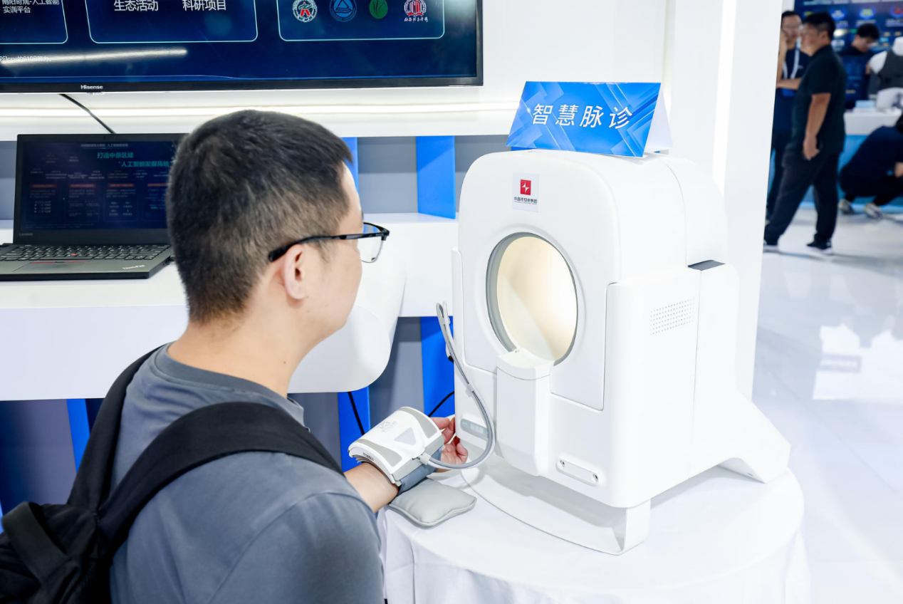 其中,基础大模型是以中国移动研究院“九天”人工智能大模型为底座开展模型训练,协同中国移动专业子公司和创新企业,将模型训练成果应用到相关领域,为行业应用提供人工智能推理和计算能力。行业大模型主要有政务大模型、医疗大模型、教育行业大模型等构成。以医疗大模型为例,在展区中出现的“AI智能中医四诊仪”和辅助辨证系统,是由河南移动、许昌市投资集团有限公司、中科芯创集团联合开发的,将传统中医的“望、闻、问、切”通过大模型训练和推理、最新的传感器技术把病人的问诊信息、脉象信息、舌象信息、面像信息等经过仪器的云端计算,逐一解读,为检测者提供中医诊断指导意见。